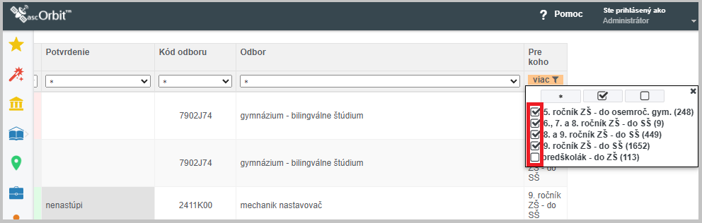 Ak si chcete vyfiltrovať napríklad iba prihlášky na stredné školy, v hlavičke stĺpca "Pre koho" kliknite na "viac".