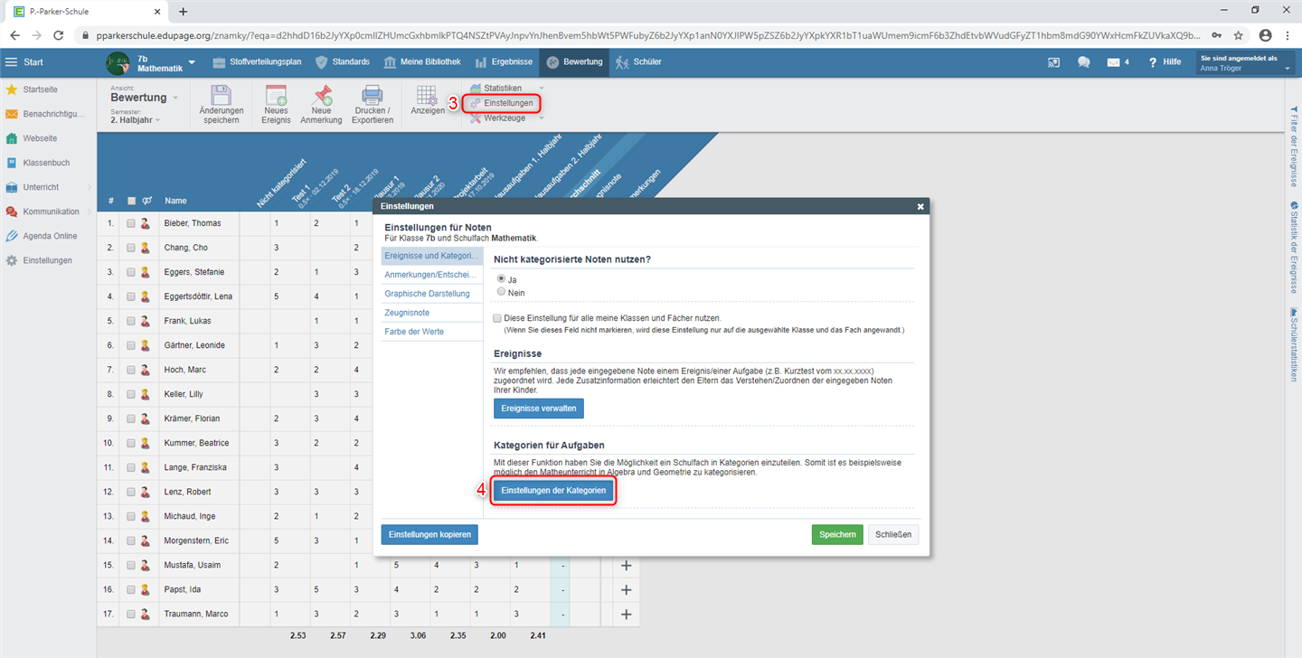 2. Um zu der Erstellung der Kategorien zu gelangen, klicken Sie auf Einstellungen (3) und dann auf Einstellungen der Kategorien (4).
