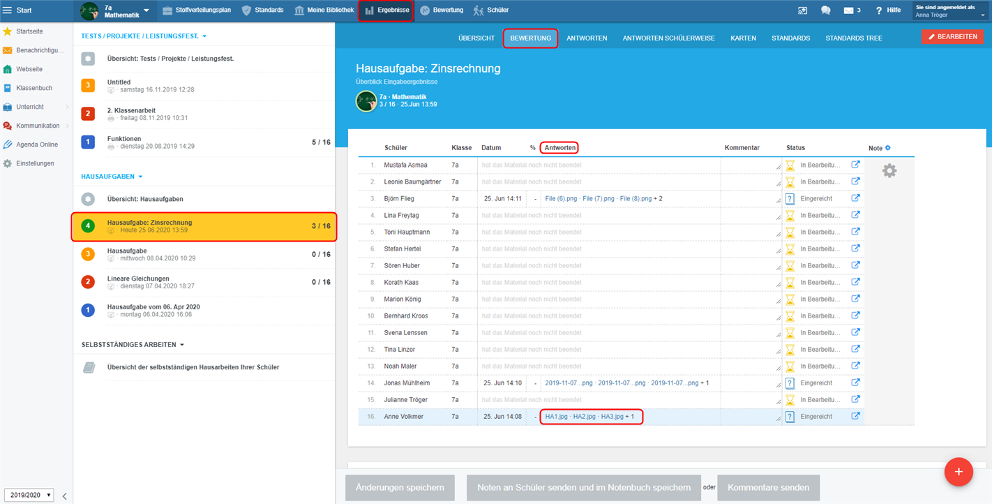 2. Wählen Sie die entsprechende Hausaufgabe aus und gehen Sie in die Bewertung.