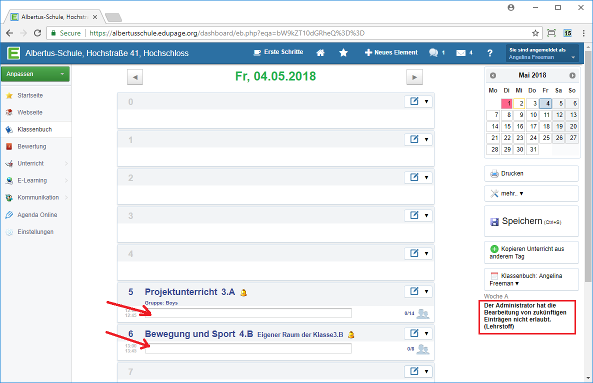 Heute (am 2.Mai) kann die Lehrkraft keinen Lehrstoff für übermorgen (4.Mai) eingeben.