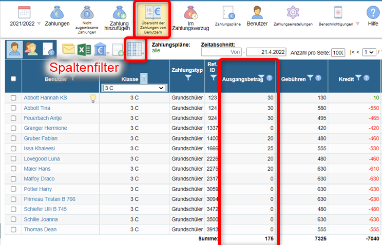 oder Übersicht der Zahlungen von Benutzern in der Spalte Ausgangsbetrag. Beachten Sie dabei, dass die Spalte Ausgangsbetrag im Spaltenfilter aktiviert ist, damit sie angezeigt wird..