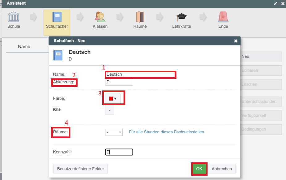 In diesem Schritt werden die Schulfächer, die in diesem Schuljahr unterrichtet werden, eingegeben: