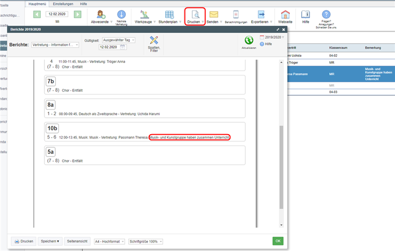 4. Die Bemerkung wird anschließend in den Vertretungsinformationen für Schüler*innen bzw. für Lehrkräfte ausgegeben.