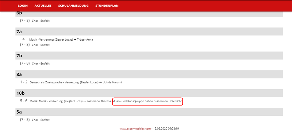 5. Und auch in der Webseite (falls Sie die Vertretung auf Ihrer EduPage-Webseite eingestellt haben) werden diese Bemerkungen ausgegeben.