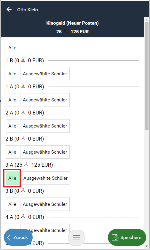 7. In diesem nächsten können Sie nun wählen, welche Schüler:innen diese Zahlung leisten sollen. Dafür können Sie einzelne Schüler:innen oder ganze Klassen wählen. Dies ist vor allem dann praktisch, wenn Sie wissen, dass einzelne Schüler:innen nicht an der Exkursion teilnehmen können.