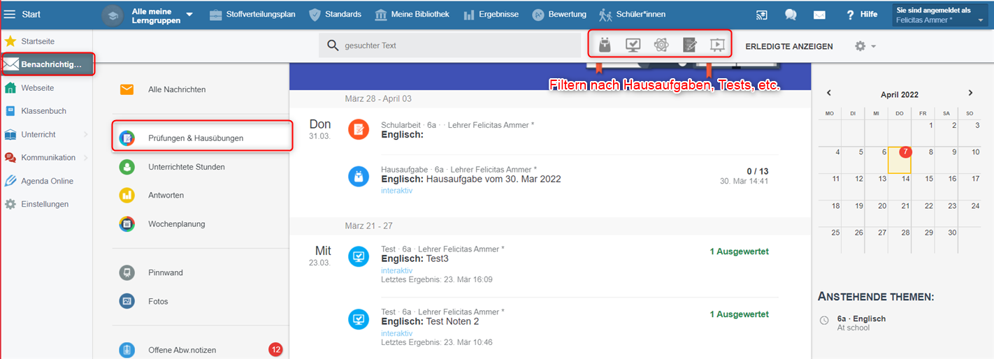 Benachrichtigung, Filter, Hausaufgaben, Tests,