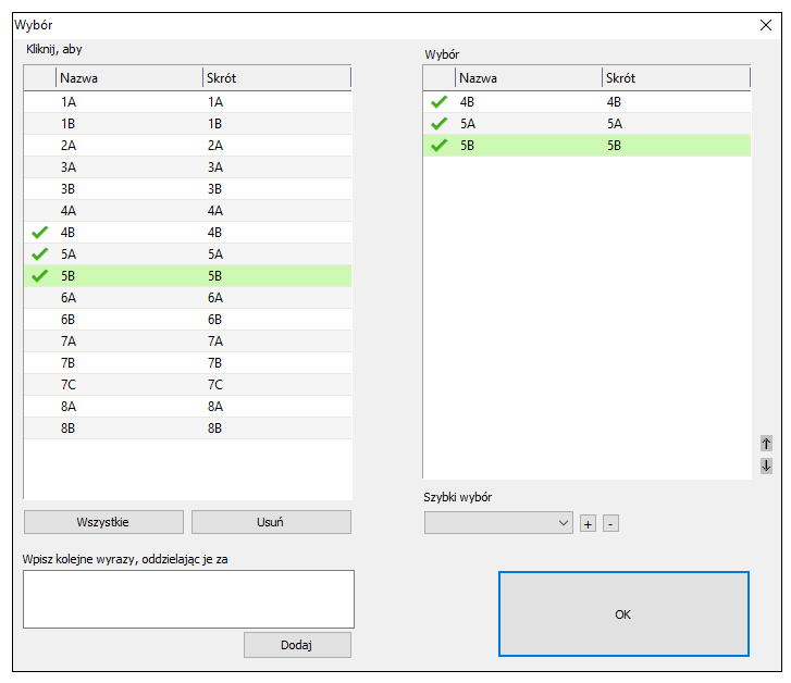 W nowo otwartym oknie wybieramy z listy po lewej stronie klasy, do których podział ma zostać przekopiowany i klikamy OK.