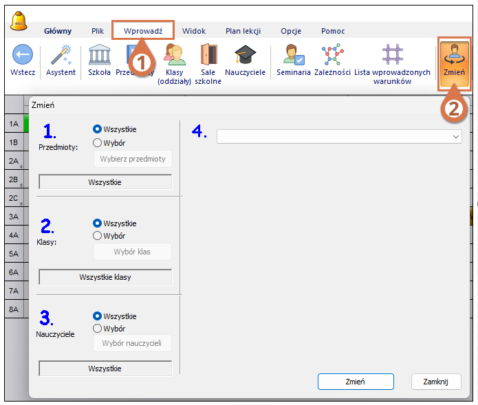 Teraz, przejdź do menu Wprowadź - Zmień and ustal lekcje, klasy lub nauczycieli, których chcesz zmienić. W końcu wybierz tydzień: