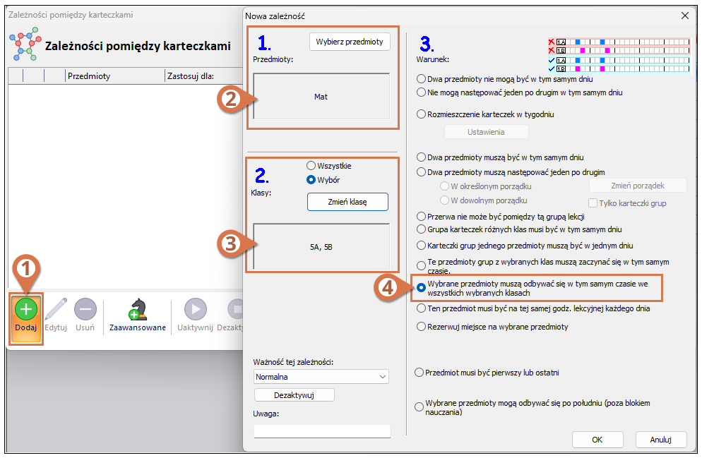 2) Jeśli warunek ma być zastosowany również dla lekcji angielskiego, należy stworzyć inną zależność międzykarteczkową. Zatem jedna zależność będzie zastosowana do matematyki, a druga do języka angielskiego. Jeśli wybierzesz dwa przedmioty w formułowaniu pojedynczej zależności między karteczkami, będzie miała inne znaczenie, czytaj 3)