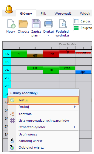 Uwaga: Możliwe jest jednoczesne testowanie przedmiotów i wiele innych opcji. Wystarczy kliknąć prawym przyciskiem myszki nad konkretną karteczką na planie lekcji.