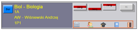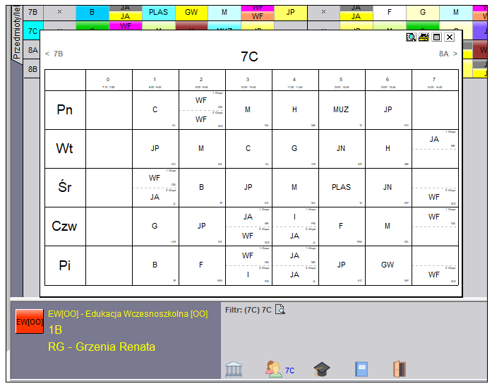 Przyciski (< >) u góry planu są używane do wyświetlania planów lekcji nauczycieli i oddziałów według kolejności następny/poprzedni. Można również znaleźć przyciski do maksymalizowania i ukrywania tego okna. Po przyciśnięciu klawisza ESC lub po kliknięciu poza obszarem okna, okno zostanie zamknięte.