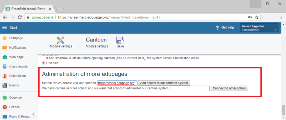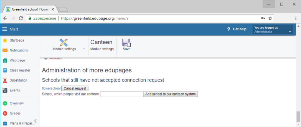 ШколаFlowers School видит приглашение от школы Greenfield School в разделе «Администрирование дополнительных страниц» своего веб-сайта EduPage в разделе «Настройки модуля (Администрирование)» модуля «Столовая», где школа может приглашение подтвердить.