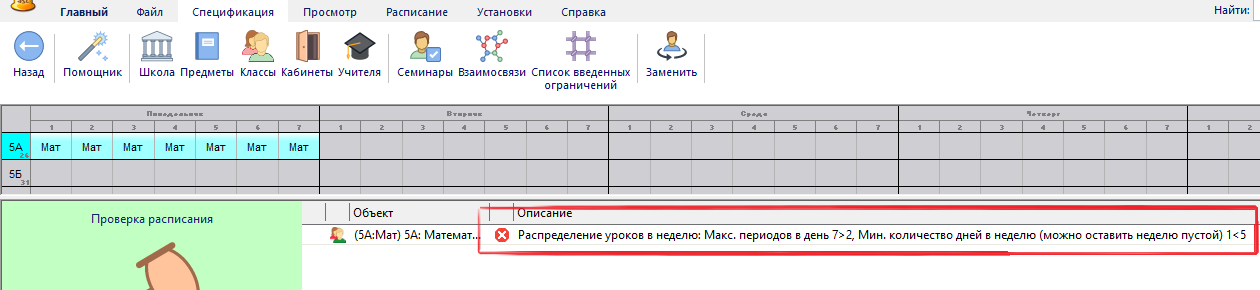 3. Среднее распределение - программа ослабляет оба ограничения, но с меньшей разницей. Максимальное количество периодов (уроков) в день - 2, минимальное количество дней в неделю - 4 дня.