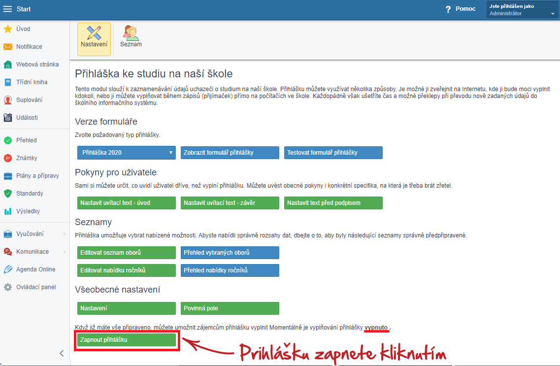 4. Aby prihláška začala fungovať, je potrebné funkciu aktivovať tlačidlom Zapnúť prihlášku, ktoré sa nachádza v nastaveniach prihlášky: