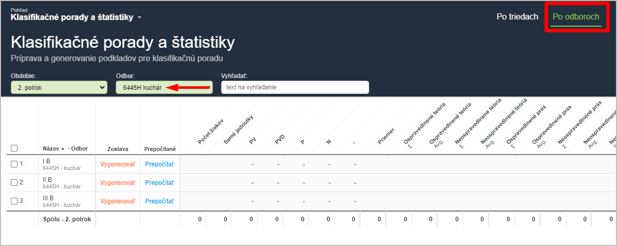 Klasifikačné podklady a štatistiky si môžete zobraziť nielen po triedach, ale aj po jednotlivých odboroch.