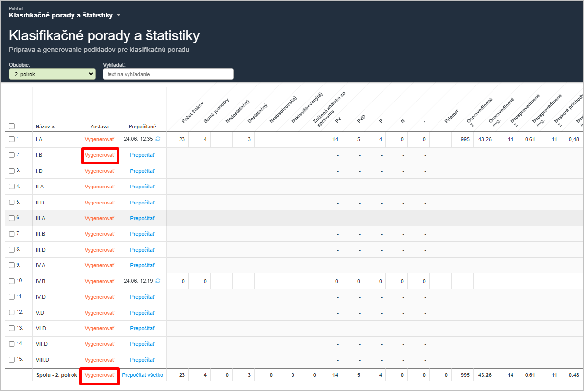 Klasifikačné podklady a štatistiky po triedach si zobrazíte takto: