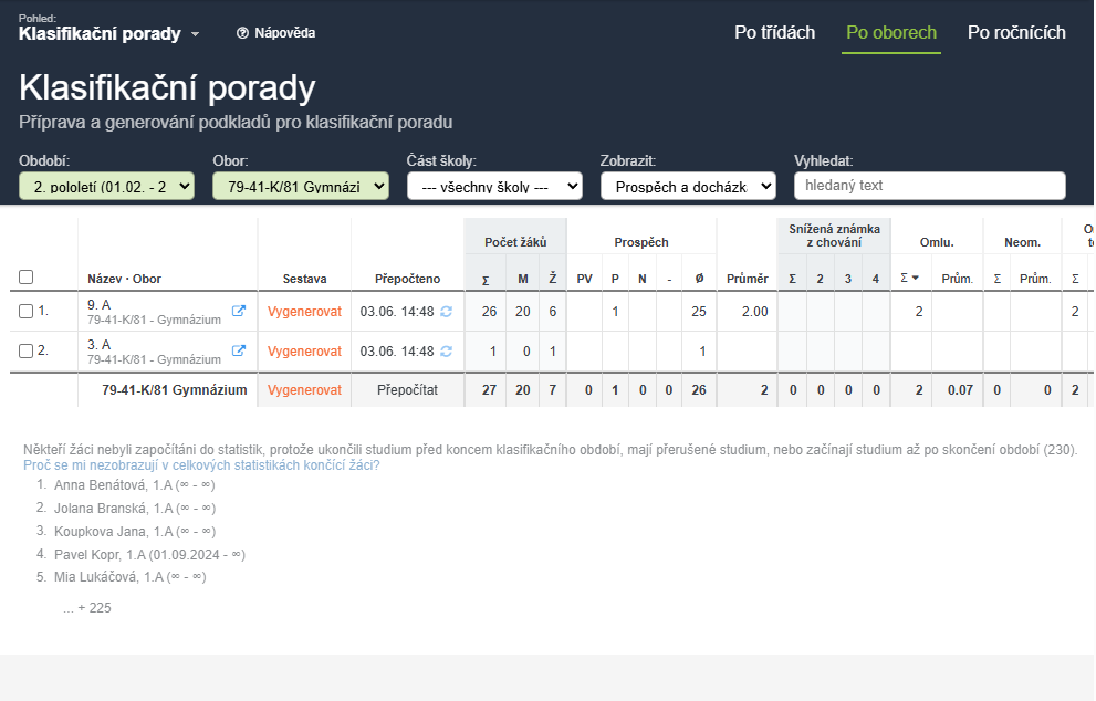 V modulu Klasifikační porady najdete klasifikační statistiky