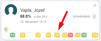 Na časovej osi vidíte, koľko času s ktorou otázkou žiaci strávili. Taktiež vidíte správne (zelené), nesprávne (červené) odpovede, čiastočne správne (žlté) odpovede.