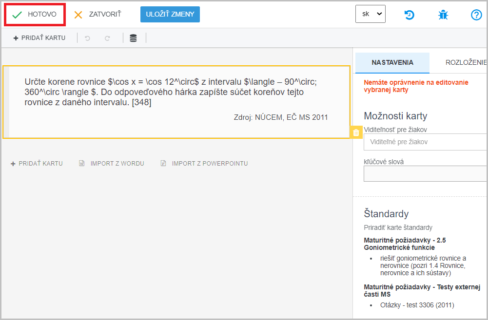 Upozornenie: zoskupovanie kariet je možné vytvárať len z vlastných kariet, nie je možné vytvárať zoskupenie s globálnou alebo školskou kartou. Z globálnej/školskej karty si môžete urobiť len kópiu bez zoskupovania.