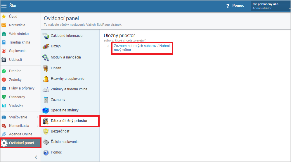 V ľavom menu kliknite na Ovládací panel/Dáta a úložný priestor/Zoznam nahratých súborov.