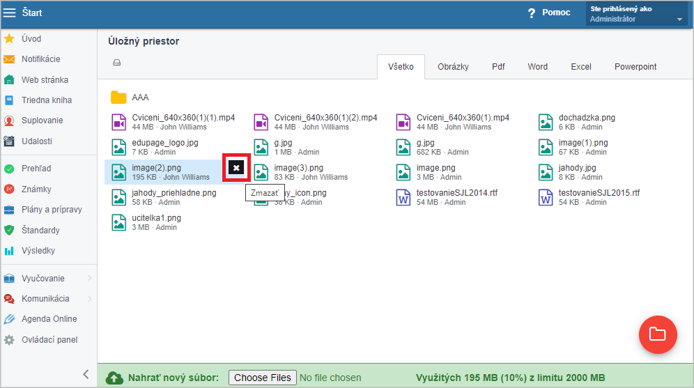 Súbory z úložného priestoru vie vymazať len administrátor.