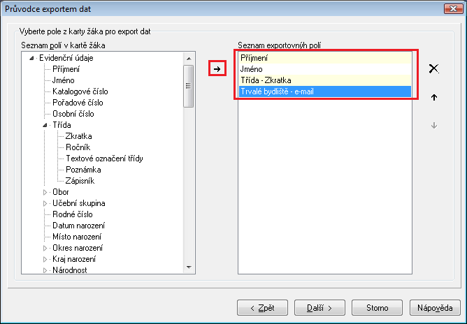 Potom vyberte "žáci"-"celá škola" a zvoľte pre export polia: "Příjmení, Jméno, Třída, Email":