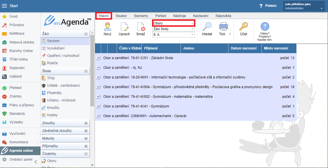 Študijné a učebné odbory do Agendy Online podľa konkrétnych požiadaviek Vašej školy pridávajte cez "Číselníky - Obory":