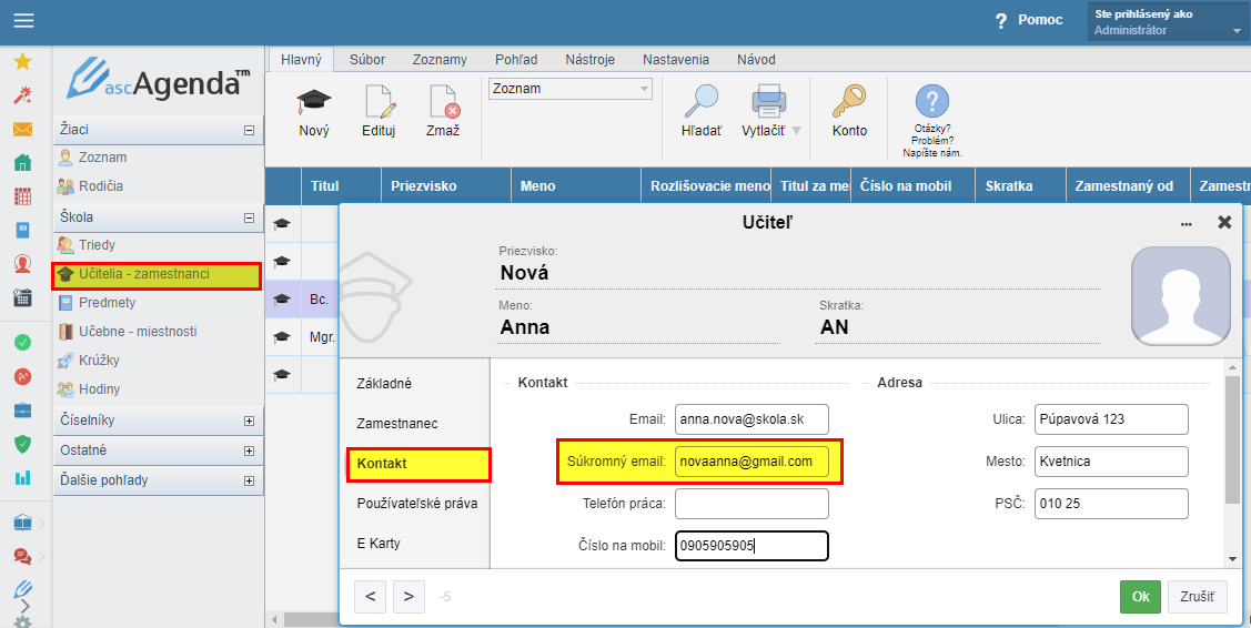 V Agende online otvorte kartu učiteľa/zamestnanca a zájdite do záložky Kontakt. Tam zadajte jeho súkromnú e-mailovú adresu.