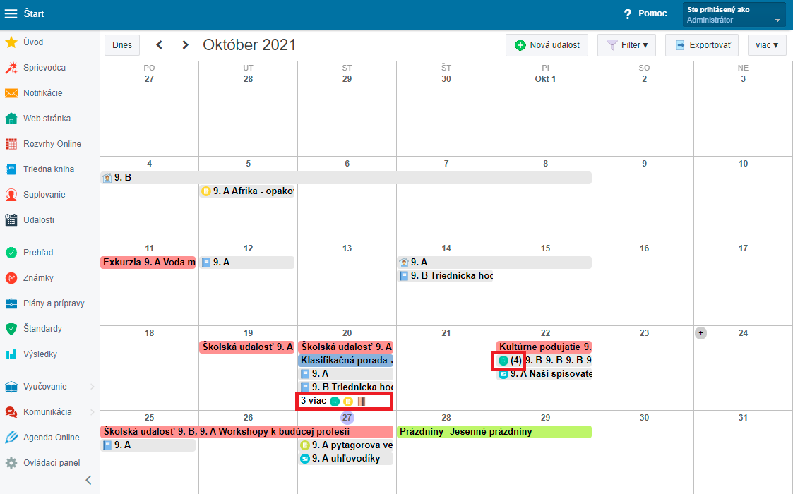 Ak je udalostí za jeden deň viac a nevmestia sa do výšky políčka, tak sa zoskupia podľa rovnakého typu udalosti alebo sa len zobrazia pomocou čísla a "viac" na koniec políčka: