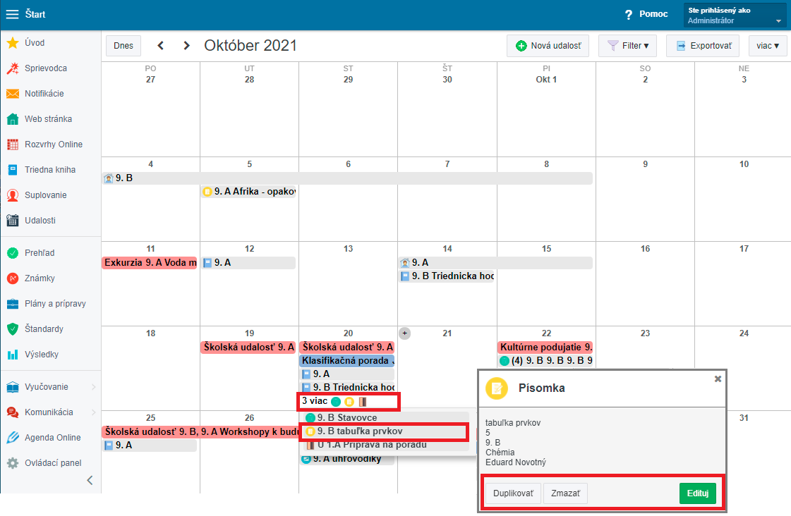 Kliknutím na daný riadok sa rozbalia všetky udalosti a kliknutím na konkrétnu udalosť môžete danú udalosť vidieť, zmazať, upraviť, duplikovať: