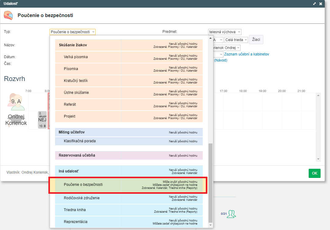 3) Zadáte názov a ponecháte neruší pôvodnú hodinu, pretože na danej hodine sa koná poučenie o bezpečnosti.