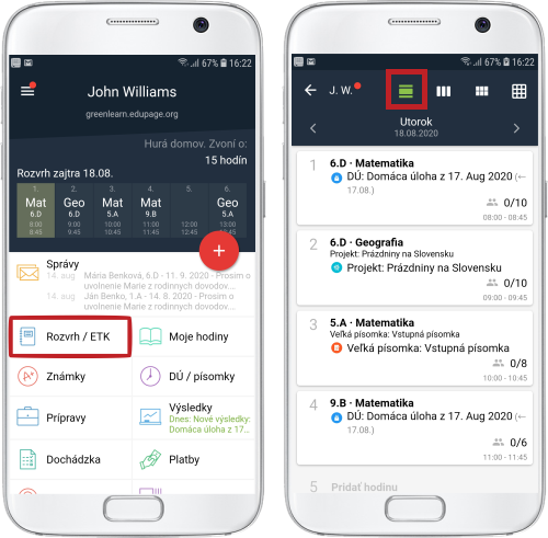 Ak vaša škola používa rozvrh, zobrazí sa vám váš rozvrh na daný deň. Ak škola používa suplovanie, uvidíte taktiež hodiny, ktoré suplujete.