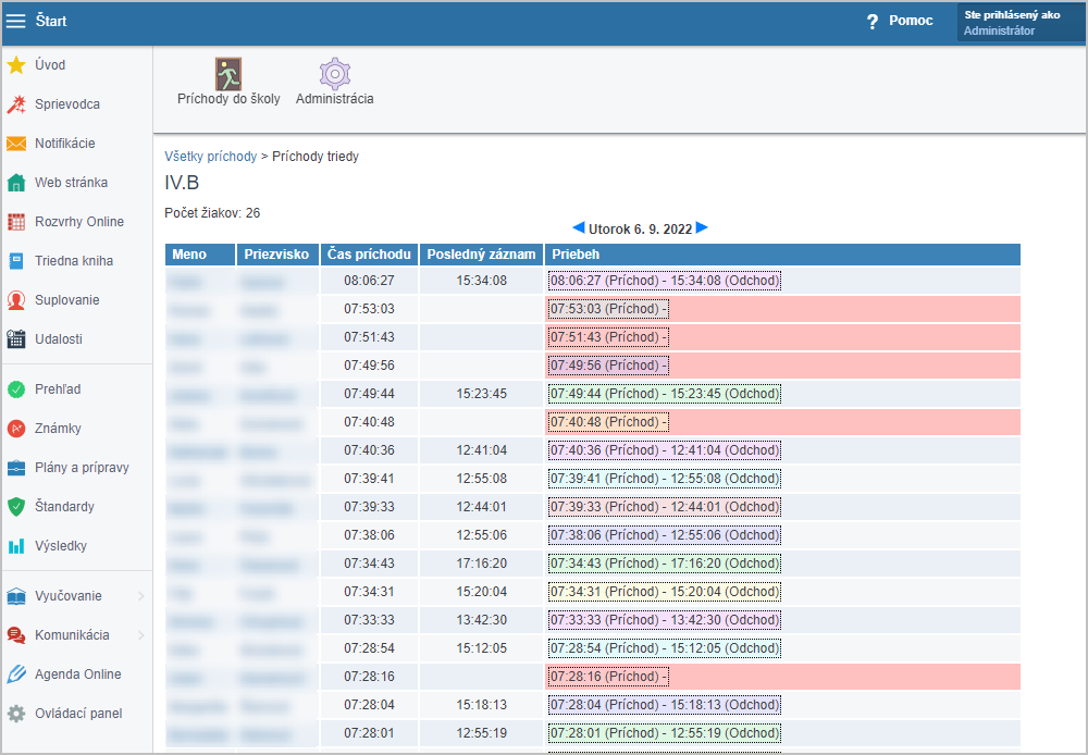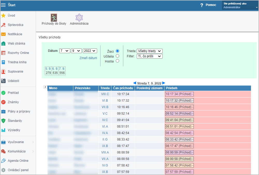 Kde nájdem pípnutia (príchody a odchody) jednotlivých žiakov?
