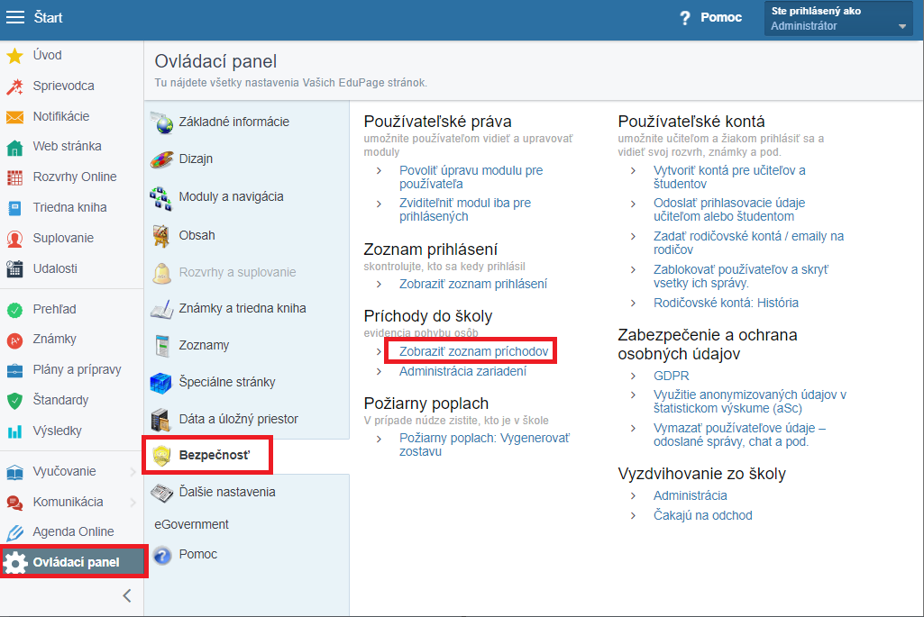 V ľavom menu zvoľte Ovládací panel/Bezpečnosť/Zobraziť zoznam príchodov.