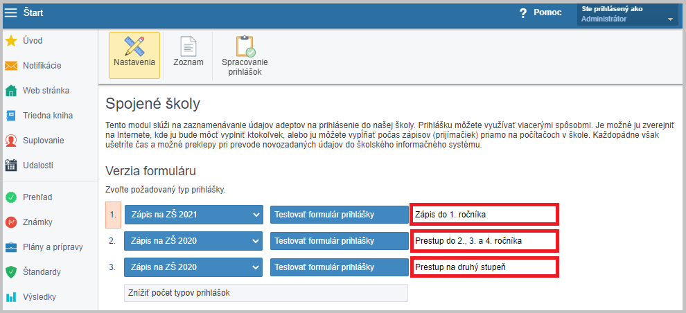 Teraz môžete vytvoriť elektronické prihlášky na prihlasovanie uchádzačov cez Vašu webovú stránku. Prejdite na administráciu elektronickej prihlášky.