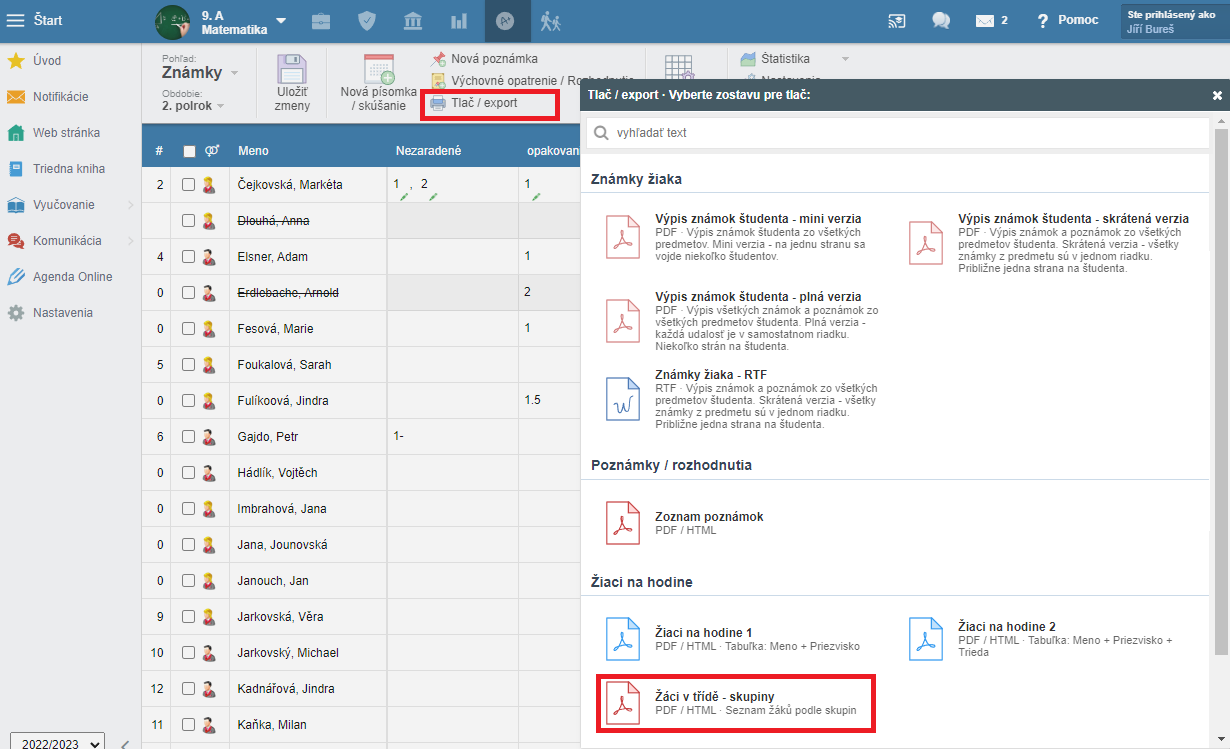 V hornom menu zvoľte známky, potom Tlač/Export. Z ponuky tlačových zostáv zvoľte žiaci v triede - skupiny
