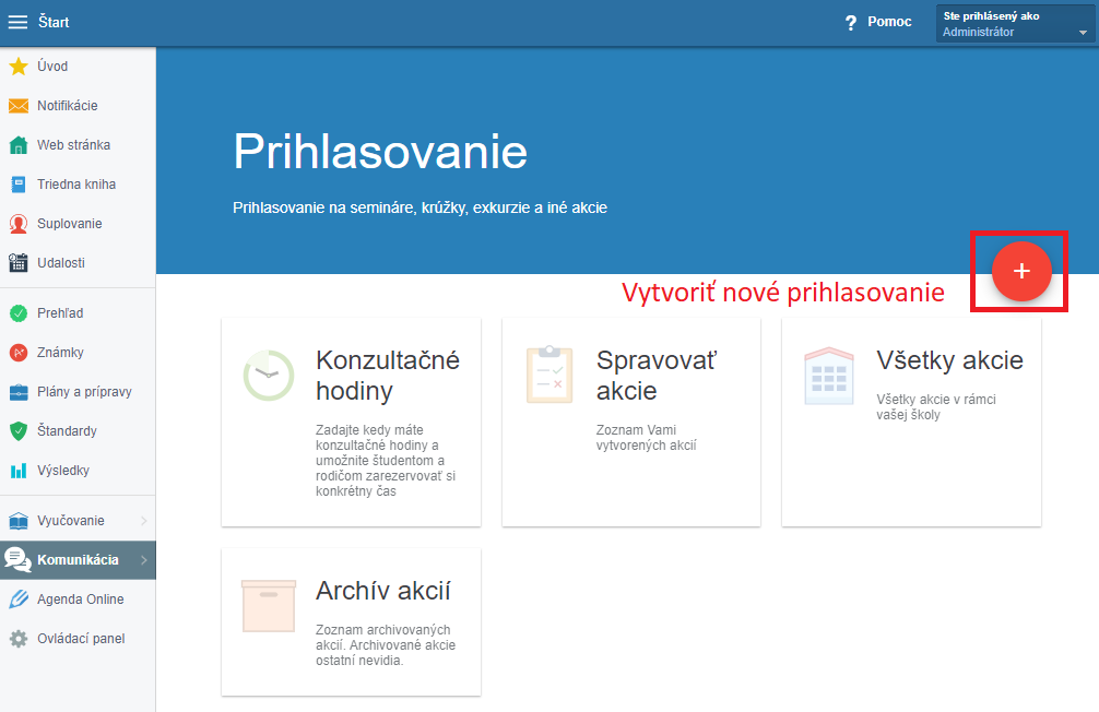 Nové prihlasovanie môže vytvoriť učiteľ alebo administrátor stlačením červeného tlačidla +