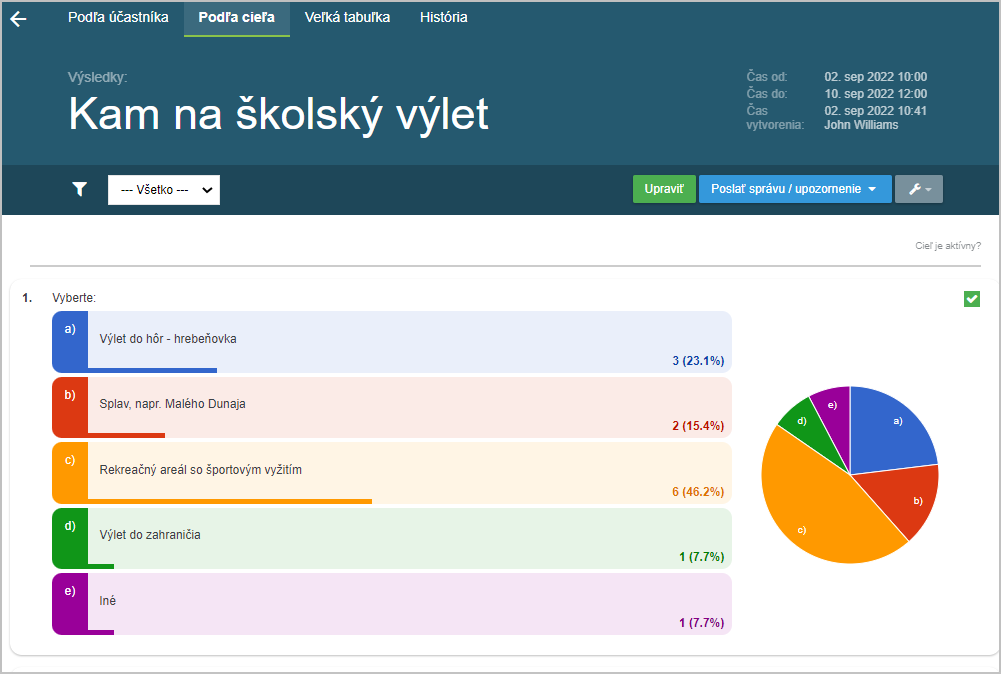 Anketa je anonymná, tj. nie je vidieť, kto ako hlasoval. Výsledky sú viditeľné iba vo forme grafu. Odporúčame zvoliť v prípade, ak nie je podstatné alebo nie je žiadúce vedieť, kto ako hlasoval.