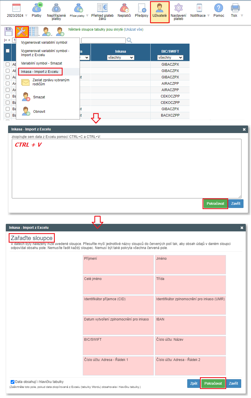 Ďalšou možnosťou ako nastaviť používateľom údaje na inkaso je hromadný import údajov pre inkaso z Excelu. Je potrebné mať pripravenú tabuľku s hlavičkou a so stĺpcami (Meno, Priezvisko, Trieda, Identifikátor príjemcu (CID), Identifikátor splnomocnenia pre inkaso (UMR), atď.). Túto tabuľku jednoducho vložíte do otvoreného okna pomocou CTRL + C a CTRL + V. Zaraďte stĺpce podľa potreby a stlačte Pokračovať.