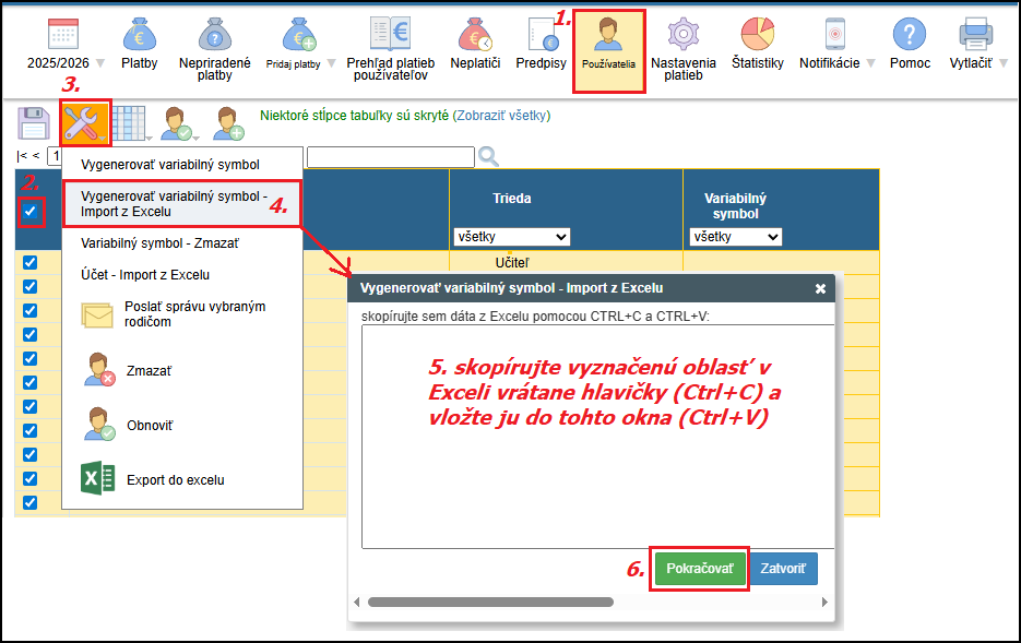 b. Na import variabilných symbolov z Excelu je potrebné mať pripravený zoznam používateľov s hlavičkou (meno, trieda a VS) v Exceli. Do dialógového okna vložte vyznačenú oblasť aj s hlavičkou cez Ctrl+C a Ctrl+V. Ak niekoho systém nenájde (napríklad kvôli chybe v mene), môžete nepriradených vyhľadať a priradiť manuálne. Importované variabilné symboly nezabudnite uložiť (viď. obrázok vyššie).