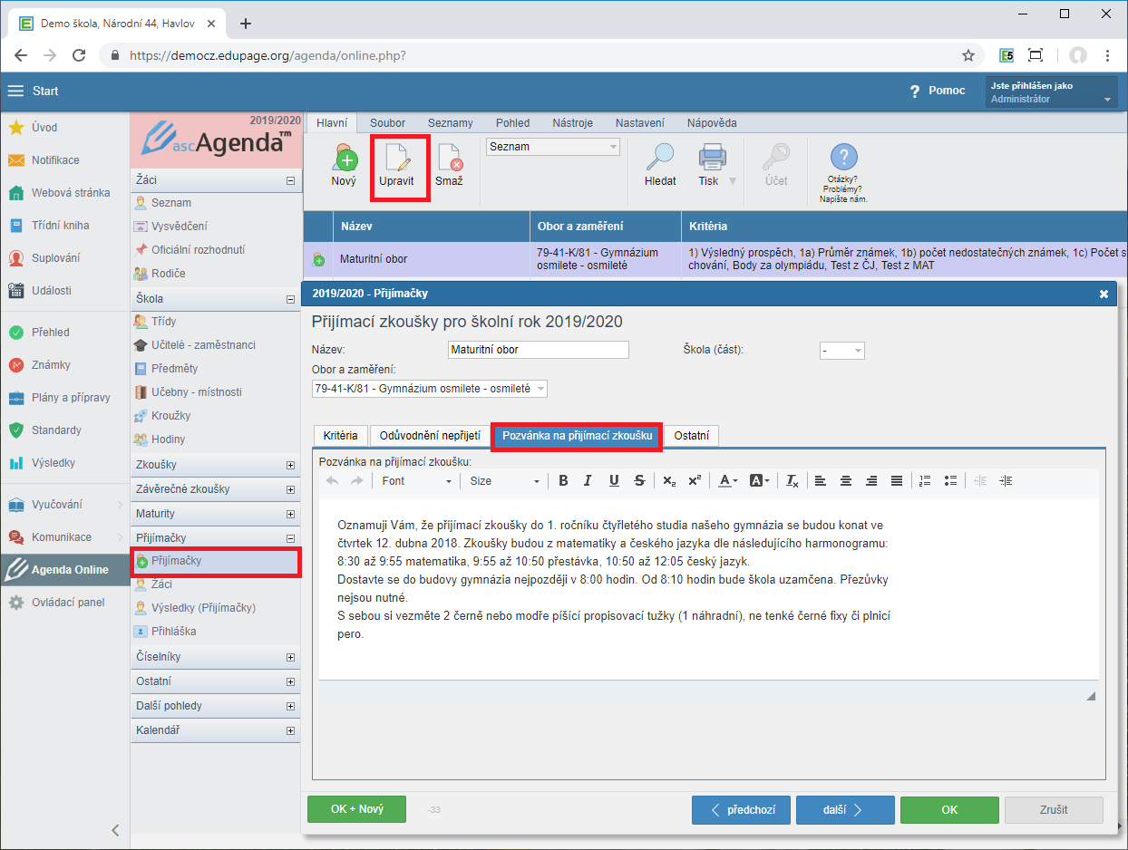 Text pozvánky k prijímacím skúškam môžete zadať v konkrétnej prijímačke v sekcii "Pozvánka na přijímací zkoušku":