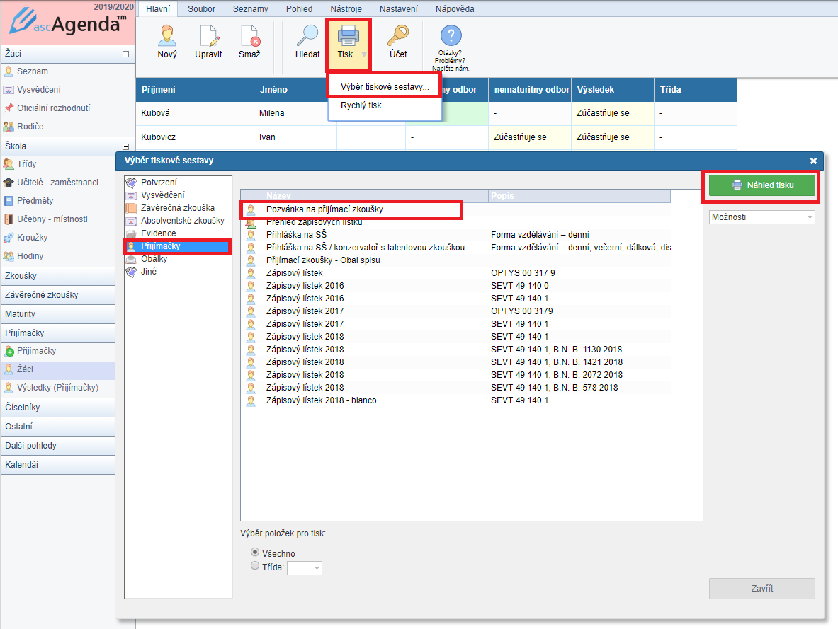 Potom danú zostavu nájdete v tlačovej zostave: "tisk - výber tiskové sestavy - Prijímačky - Pozvánka na přijímací zkoušky":