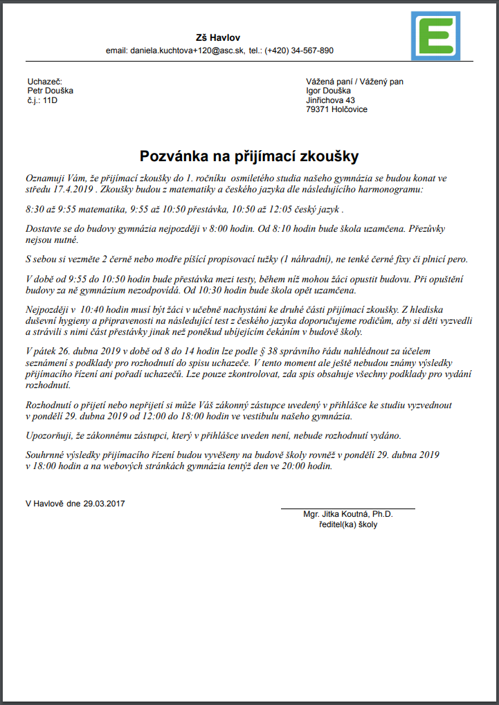 a vygeneruje sa vám pozvánka pre daného uchádzača, s adresou zákonného zástupcu: podľa toho, čo je vyplnené v karte prijímačkového žiaka