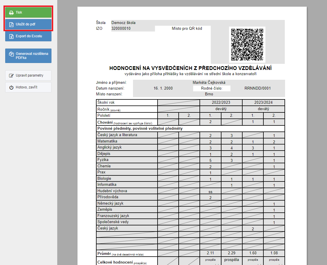 Ako vytlačiť hodnocení na vysvědčeních z předchozího vzdělávání?