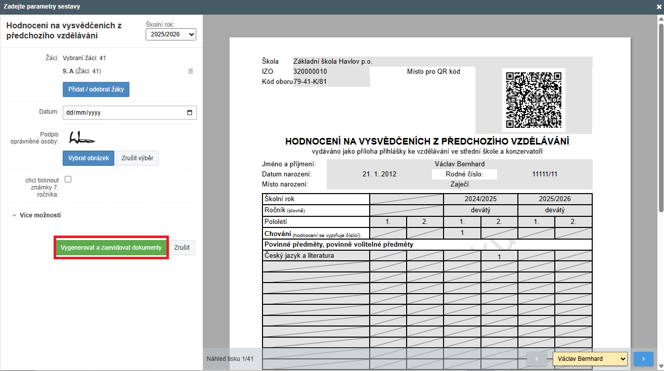 môžete takisto vybrať podpis a vygenerujete dokumenty žiakom: