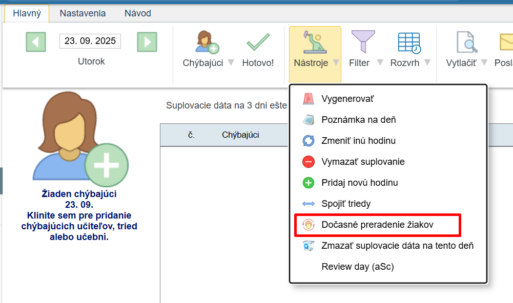 V Edupage je možnosť dočasne rozdeliť deti z jednej triedy do iných tried. Napr. v situácii, ak je jedna pani učiteľka neprítomná alebo kvôli chorobnosti chýba veľký počet detí. Dočasné preradenie detí vytvoríme v module Suplovanie , kde cez Nástroje vyberieme Dočasné preradenie detí. Dočasné preradenie detí je možné vytvoriť iba ak je hodina zadaná na časť dňa alebo časový interval. Nie je to možné pri hodine, ktorá je zadaná na časový interval.
