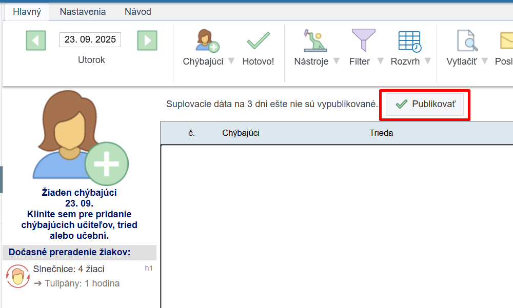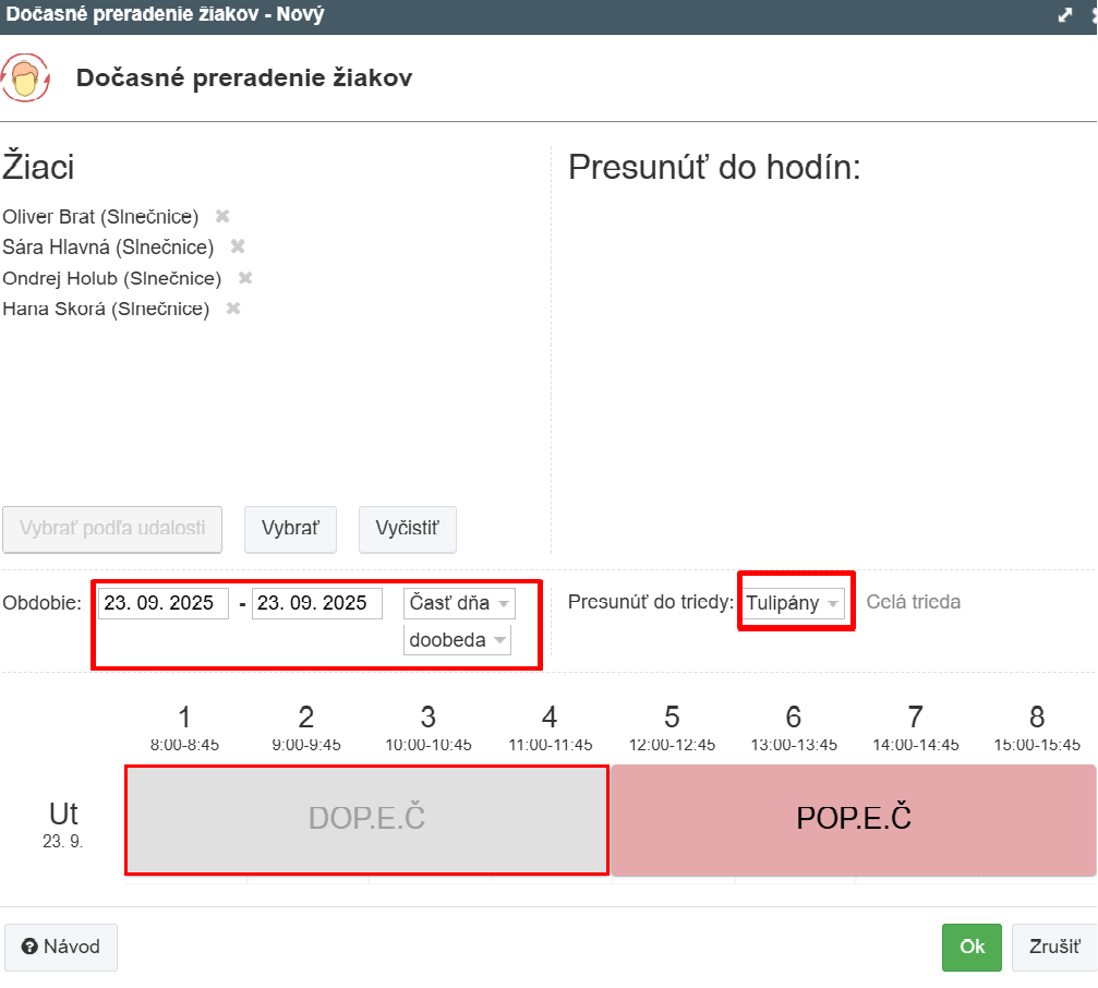 V našom prípade chceme preradiť 4 deti z triedy Slnečnice do triedy Tulipány na deň 23.9.2025 na hodinu Dopoludňajšia edukačná činnosť.