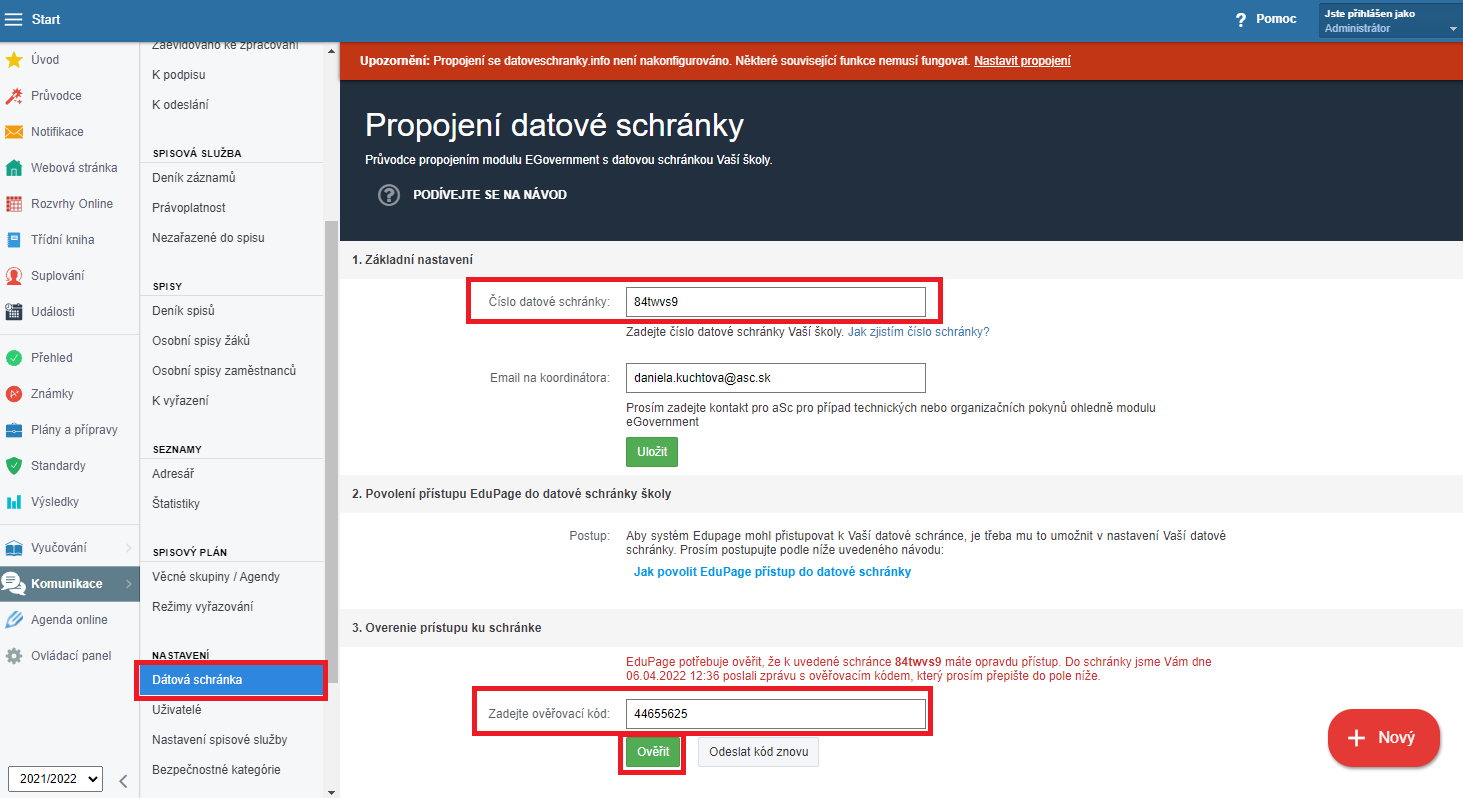 3. Prepojenie dokončíte v module eGovernment v sekcii "Nastavenia", kde zadáte číslo vašej dátovej schránky a overovací kód, ktorý vám príde do vašej dátovej schránky a zvolíte "ověřit":