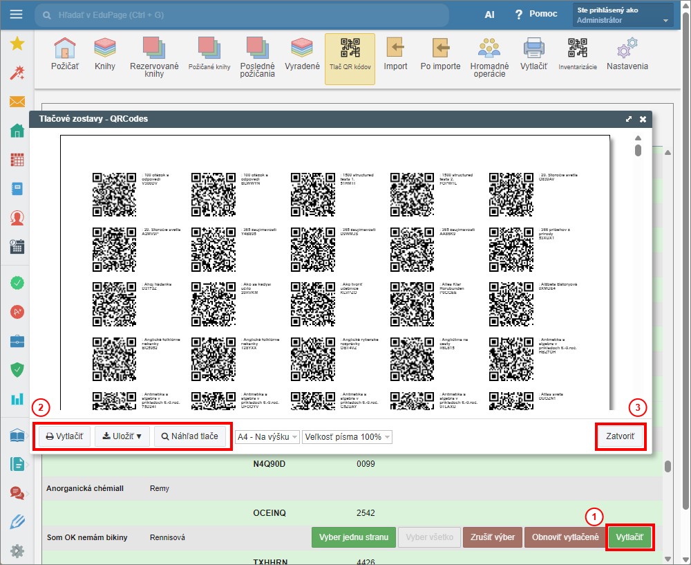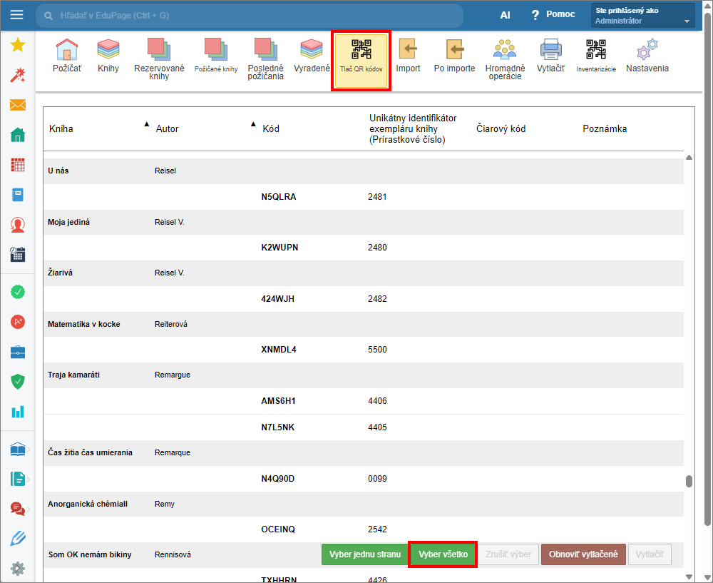 Tlač QR kódov pre pridané knihy/učebnice