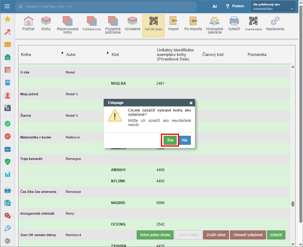 Po vytlačení sa zobrazí hláška, či je môže dané kódy považovať za vytlačené. Ak tlač prebehla v poriadku, vyberte "Áno". Exempláre kníh, ktorým ste vytlačili QR kódy, budú odstránené zo zoznamu na “Tlač QR kódov”.